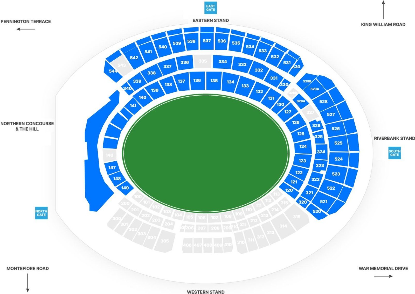 Adelaide Oval is a multipurpose stadium in Australia. It is situated in Adelaide; therefore, it is known as Adelaide Oval Stadium. It is primarily used for hosting cricket, Australian rules football, rugby union, rugby league, soccer, and tennis. It is a primary venue in Australia, regularly used to host sporting events. The current seating capacity of the ground is 53,500, and it can accommodate approximately 70,000 visitors during concerts. It is one of Australia’s largest stadiums in terms of seating capacity. The Adelaide Oval seating map with rows and seat numbers helps visitors easily locate their seats.
