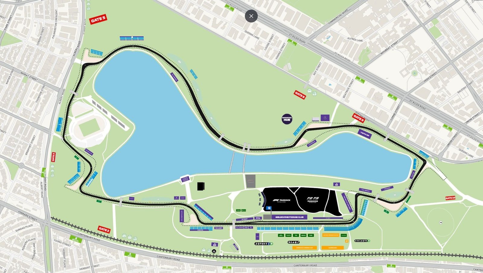 It has multiple entry gates, and the Albert Park entry gates are marked on the map. The admission ticket contains the entry gate number for the event and it can be matched with the map.