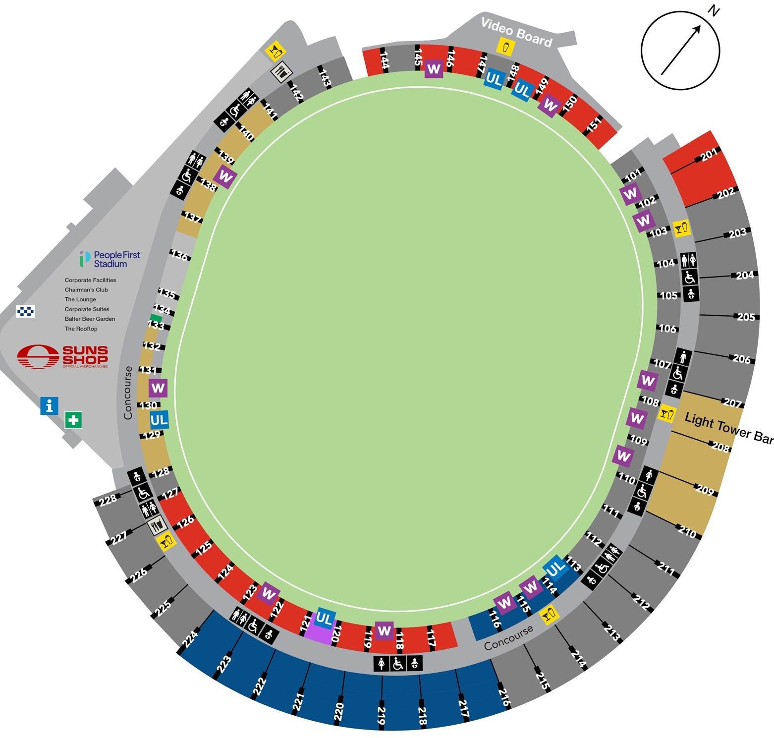 The locations of all stadium entry gates, along with facilities, nearby roads, landmarks, streets, etc., are depicted on the People First Stadium map layout.