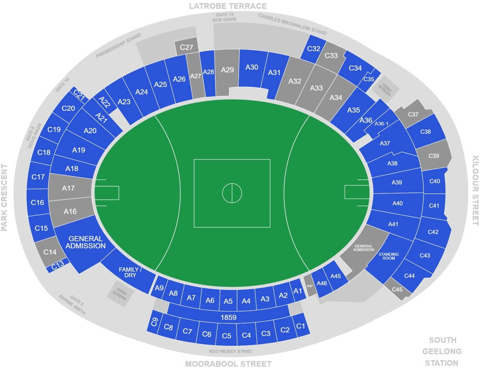 Matches of the Australian Football League are hosted at Kardinia Park during the AFL season. The locations of the general admission area, reserved seating, premium seating, VIP seating area, and the names of the stands, rows, sections, entry gates, etc., are shown on the GMHBA Stadium seating chart with seat numbers for AFL.