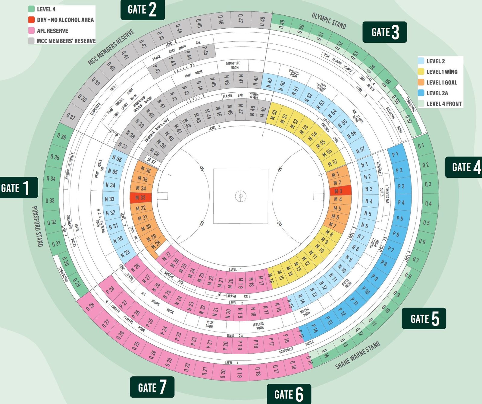 MCG is Australia’s largest sporting ground; therefore, it is the most favourite venue for Australian Football League matches. The location of all the entry gates, along with the names of the stands, is mentioned on the map. The Shane Warne stand, Olympics stand, Ponsford stand, MCC members’ reserve stand, etc., are depicted on the MCG seating map with rows and seat numbers. The locations of the corporate suites, executive suites, bar area, legends room, Miller room, Wills room, AFL dining room, Ryder room, Hassett room, lounge room, and committee room are shown on the map.