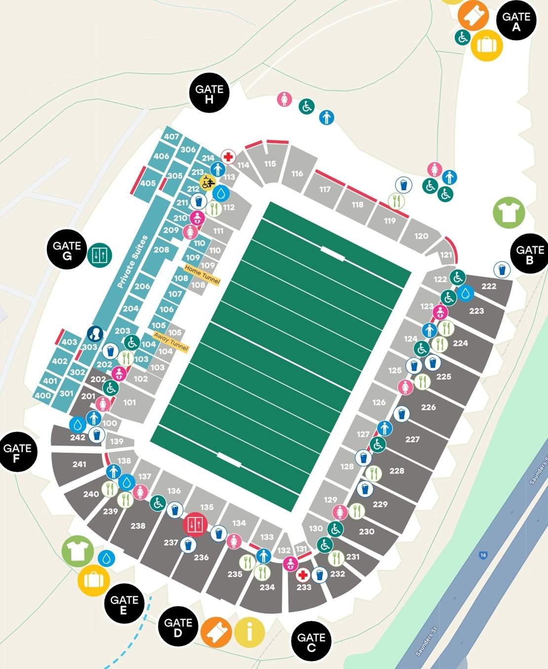 The detailed map of the stadium shows all the important information about the ground, along with the seating layout. The location of nearby roads, restaurants and bars, food courts, elevators, wheelchair access points, ticket office, merchandise counters, etc., are mentioned on the ground map. More than 25000 seats of the stadium are divided into multiple stands, rows, and bays.