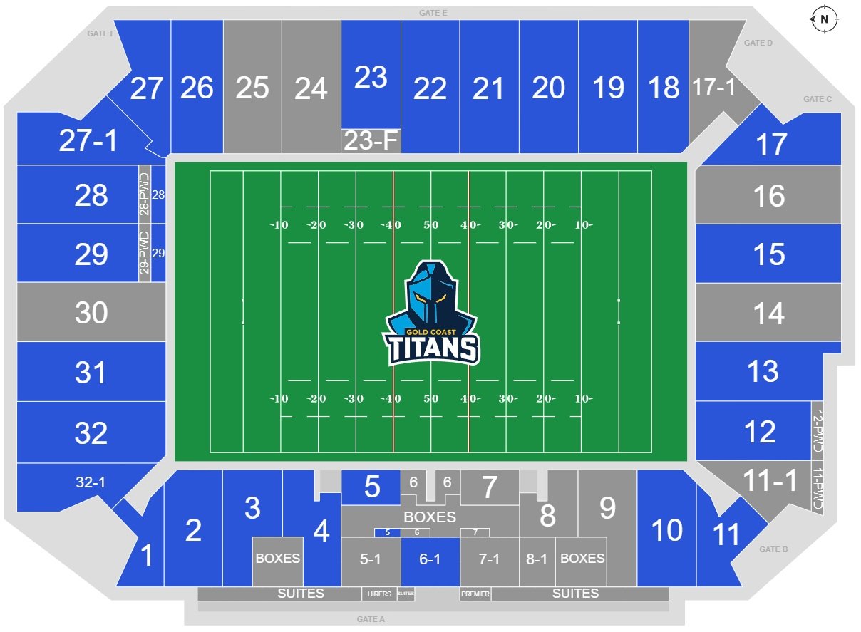 The games of the Gold Coast Titans NRL team are played at this ground during the National Rugby League season. The Cbus Super Stadium Seating Map for NRL matches is available on the webpage to help you locate seats during the season. It is a big ground and it can accommodate more than 27000 NRL fans during the game. Visitors can print these maps while visiting the stadium to easily find their seats. The locations of the general admission area, premium seats, suites, box seats, all six entry gates, visiting fans seating, and the Gold Coast Titans fan area are shown on the map. The Gold Coast Titans seating map with rows is pretty helpful during the NRL games.