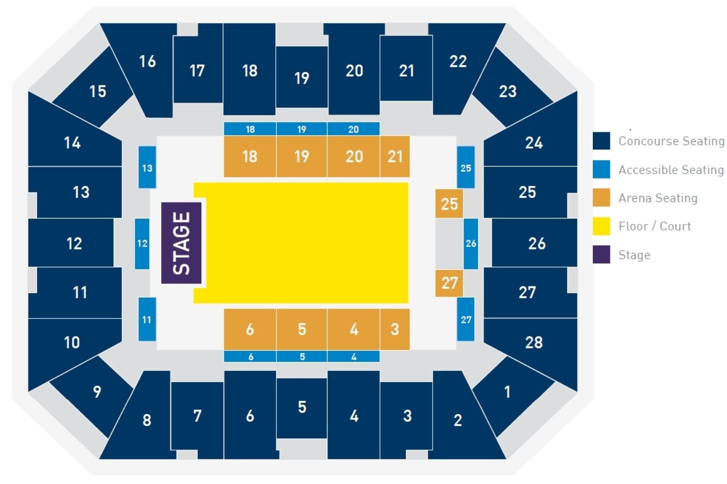 The number of seats can be increased during concerts, and the map above helps you find seats easily inside the stadium. The locations of concourse seating, accessible seats, arena seats, on-field seats, and the performance stage are shown on the map in different colours.