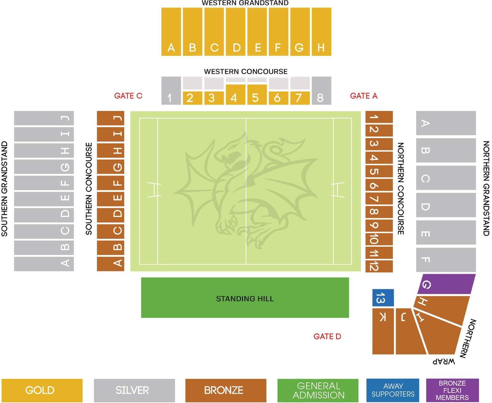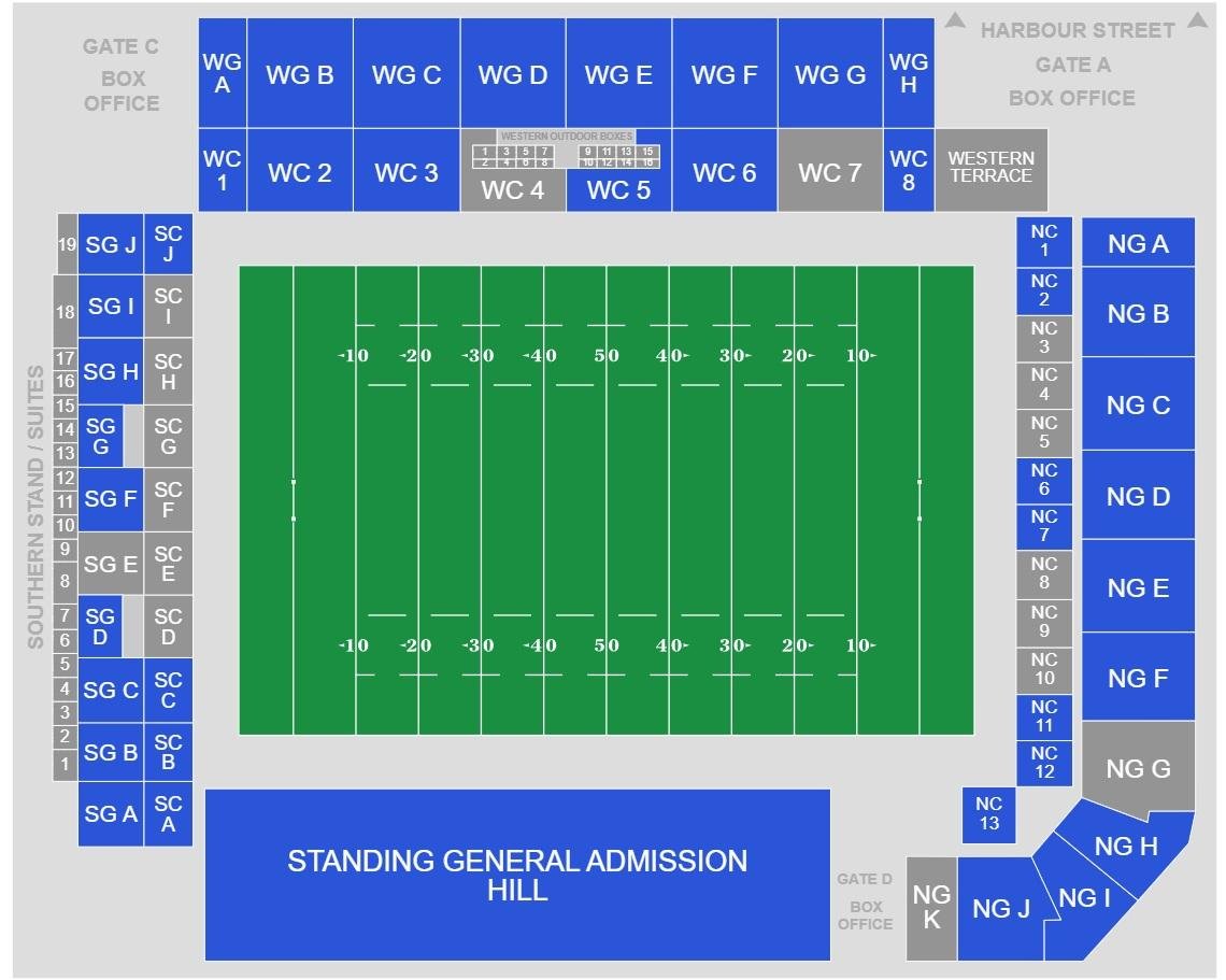 The seats behind the goal posts in the North and South stands are good for atmosphere and witnessing the scoring moments at Wollongong Showground Stadium. The seats in the premium categories provide a good experience of the game along with a great view at a premium price. The last row seats and the corner seats should be avoided due to limited view.
