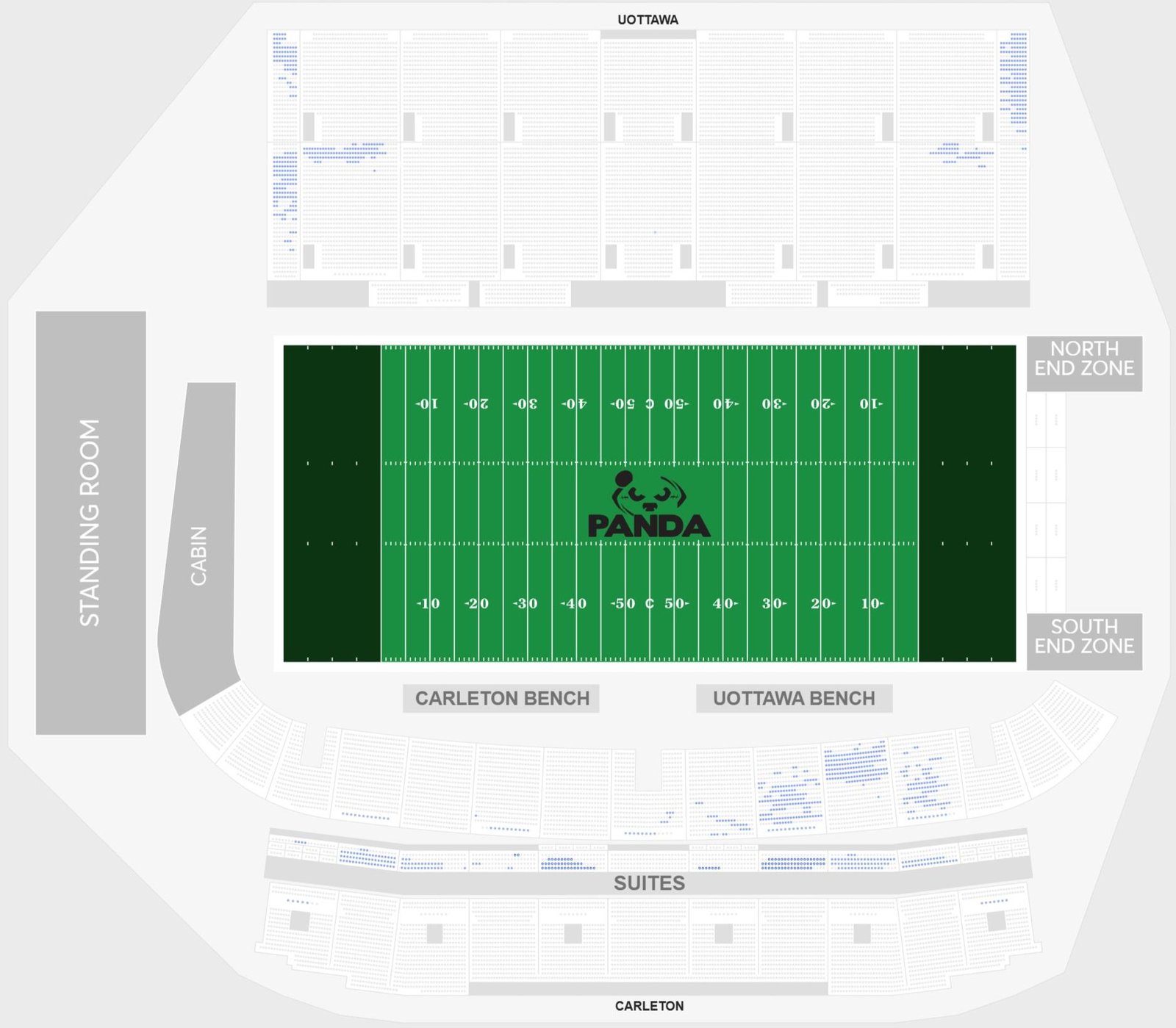 We have published a detailed map of the Stadium at TD Place with the location of all the seats of the stadium along with the stands and rows for the convenience of visitors. This detailed map contains the location of the field along with the location of the north end zone, south end zone, standing room, cabin, etc. The location of the home team bench and the visiting team bench can also be seen on the map. The TD Place Stadium seating chart depicts the location of suites, premium areas, and hospitality areas on the map. These printable maps can be carried on the ground to find the reserved seat during the games.