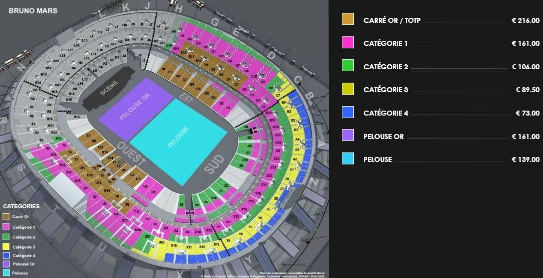 The premium sections with hospitality services and great comfort are the most expensive tickets for the Bruno Mars concert in France. The seats in category one and the on-field section in purple are also among the most expensive seats. The rate lists of all the sections, along with the seat categories, can be seen on the stadium map.