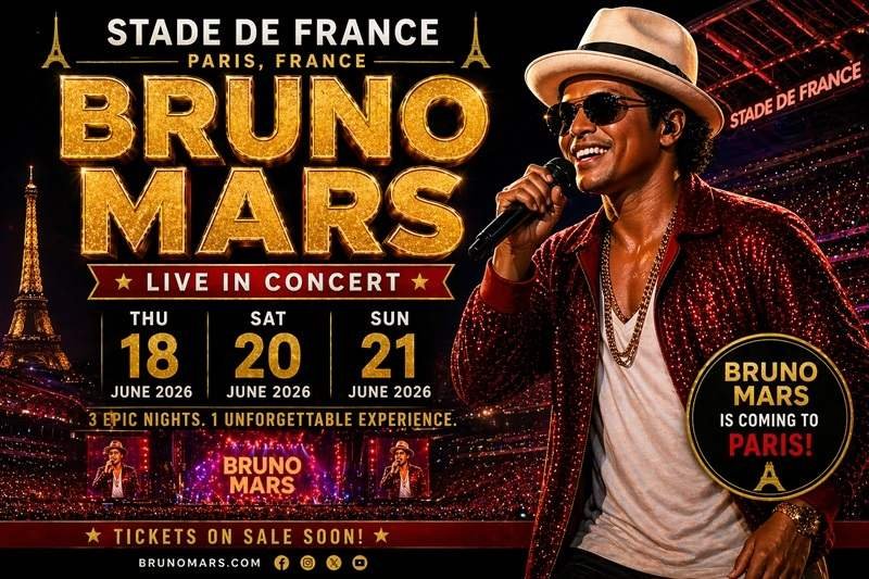 Bruno Mars is in Paris for the Romantic Tour Concert for three nights in June 2026.