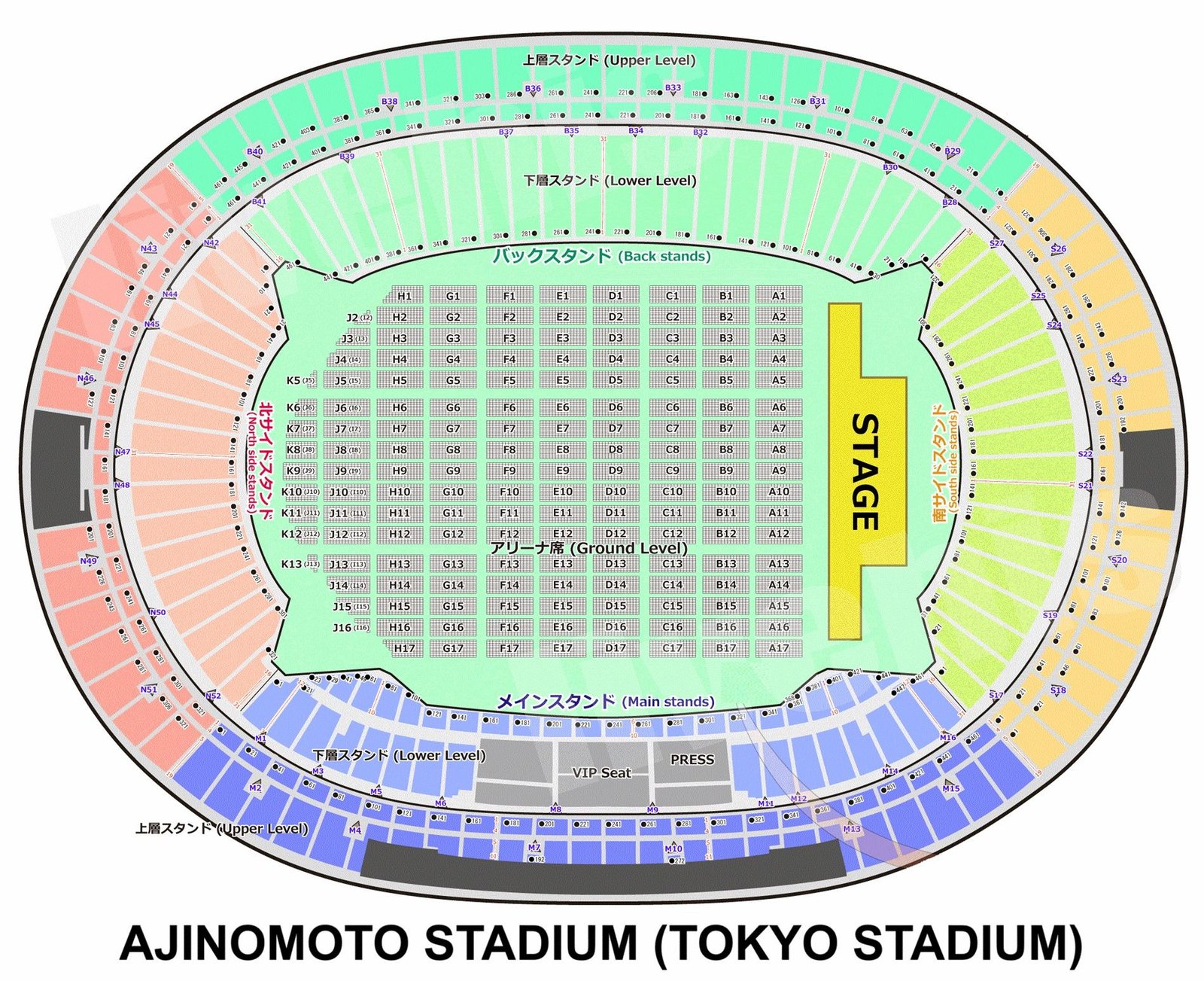 A performance stage is set up on the field along with the temporary sitting areas and standing areas to accommodate additional crowd to enjoy the event. Visitors can easily locate their seats with the help of the Ajinomoto Stadium seating layout. The location of the premium seating, VIP seating, press box, terrace, executive suites, clubs, boxes, etc are also depicted on the stadium seating chart.