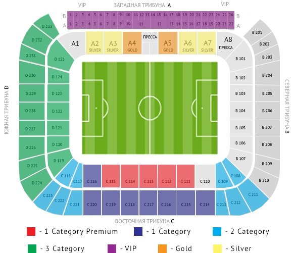 All the categories of the Lukoil Stadium are mentioned on the seating chart arrangement maps. The categories are defined based on ticket prices and other facilities. The general admission area, hospitality area, VIP areas, etc, are depicted for easy identification. These printable maps can be carried inside the stadium.