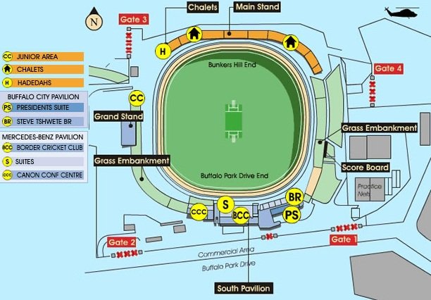 Visitors can easily locate their seats with the help of the Buffalo Park seating map in South Africa. The locations of nearby areas are also displayed on the layout map. The location of the pitch, ends of the stadium, cricket boundaries, pavilions, etc are marked. It is one of the most picturesque stadiums in South Africa.