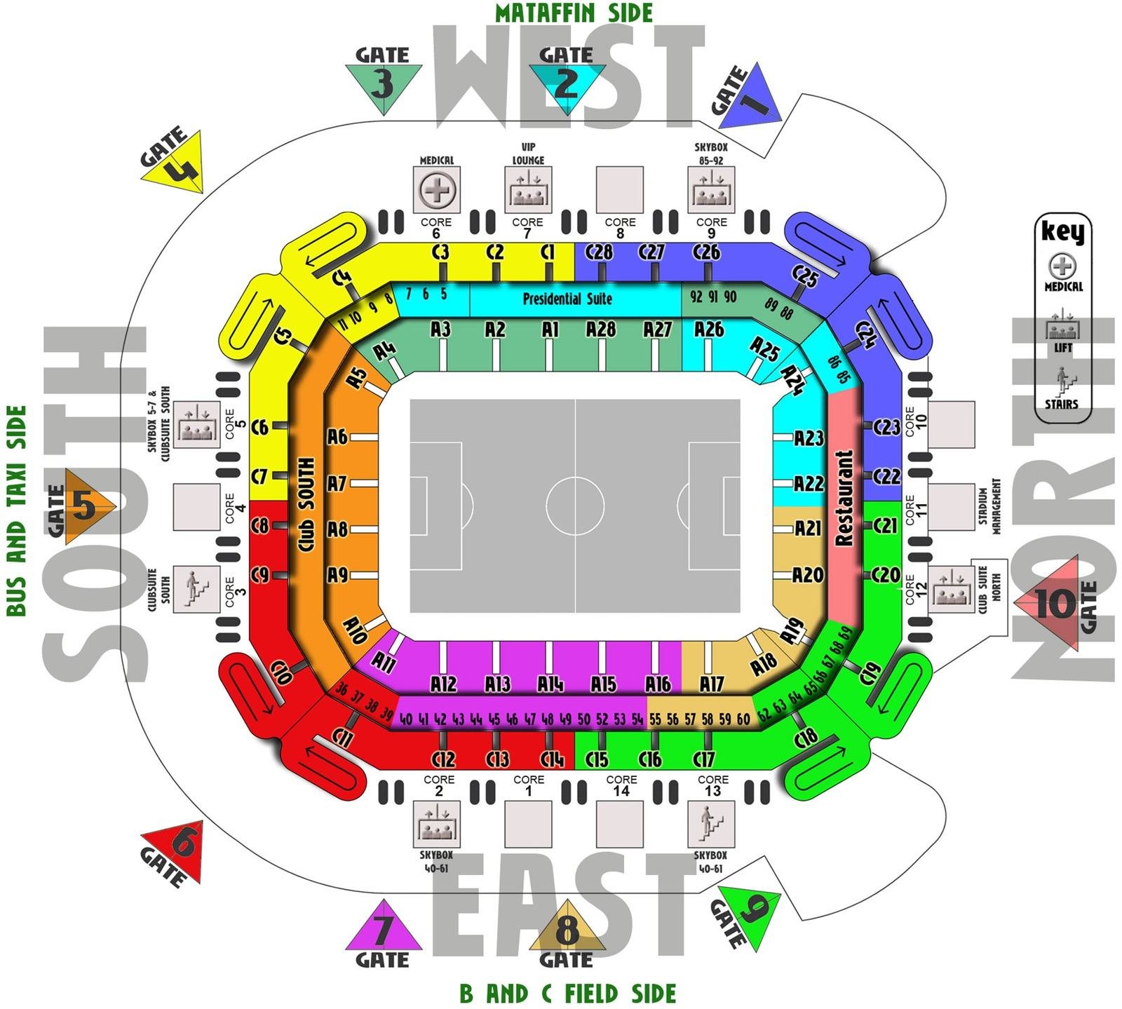 This Stadium has 10 entry gates, and the location of all the doors is mentioned on the map. The location of the stand, along with its names and row numbers, can be seen on the seating arrangement chart. The location of the lift, stairs, and medical facilities is also depicted on the seating layout. Premium seating options, such as VIP seating, Clubhouse seating, and lounges, are indicated on the map.