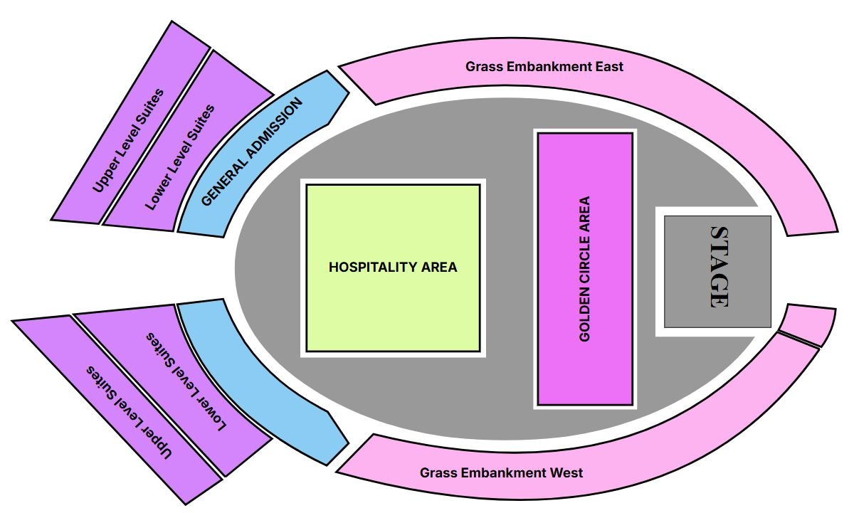 The field of the ground is used to set up the performance stage, along with the temporary seating and standing areas to accommodate a large crowd. The location of the performance stage, along with the hospital area and the Golden Circle area in front of the stage, is mentioned on the map. General admission area, premium seating, suites, etc are also mentioned on the map for easy identification. It is easy to locate seats with the help of the Centurion Park concert seating plan with rows and seat numbers.