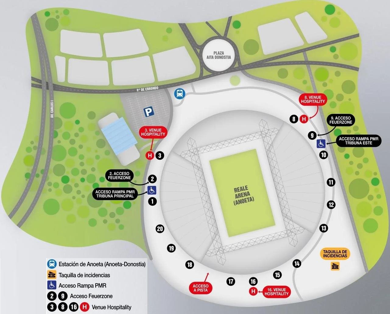 Reale Arena tickets are difficult to book during La Liga and other high voltage events. It can accommodate 40000 visitors during sports and entertainment events. We have shared multiple seating layouts of the ground to locate seats.