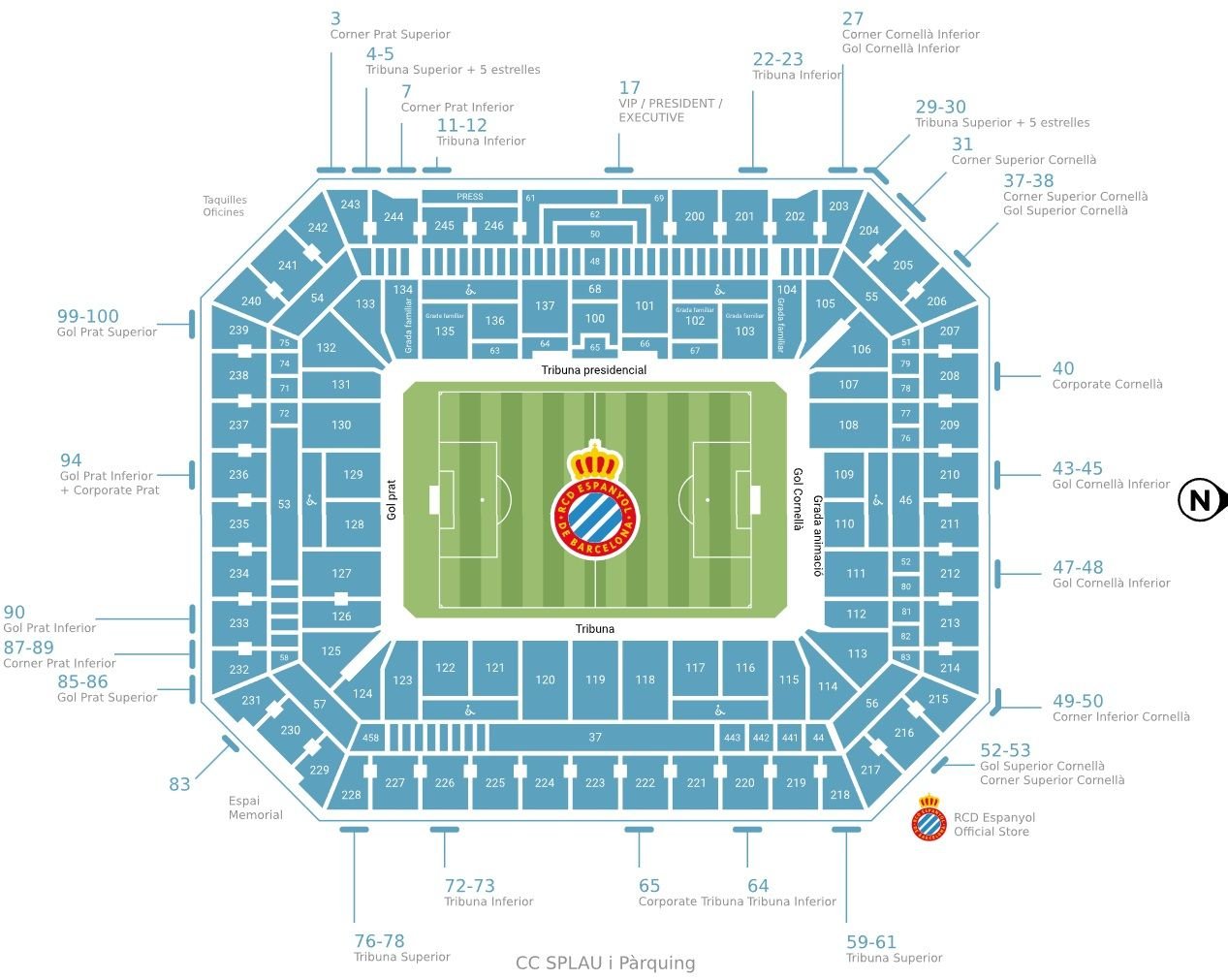 The seating layout of the stadium is quite valuable for locating the seats during football games and La Liga competitions. The detailed map of the RCDE stadium locates the location of all the stands along with their rows and sections. RCD Espanyol official store, admission doors, premium seating, accessible seating, dugouts, etc, can be seen on the map.
