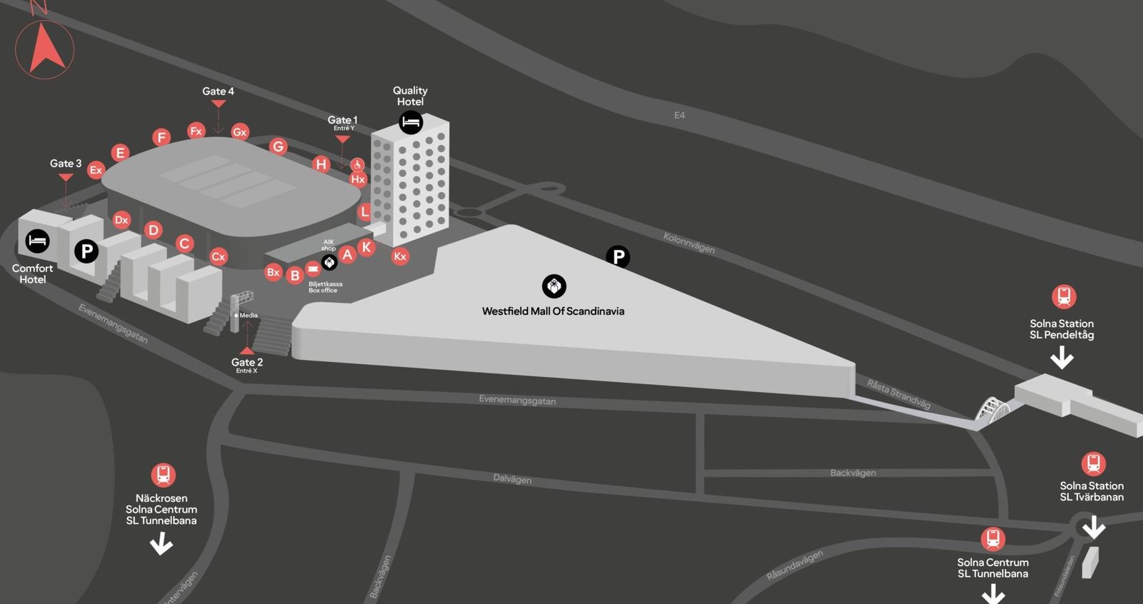 The location of the nearby streets, expressways, public transport options, train stations, stadium, shopping mall, Quality Hotel, and other important landmarks are displayed on the Strawberry Arena layout. This layout is quite convenient for reaching the stadium. The location of all the admission doors with pedestrian areas is mentioned on the Strawberry Arena map.