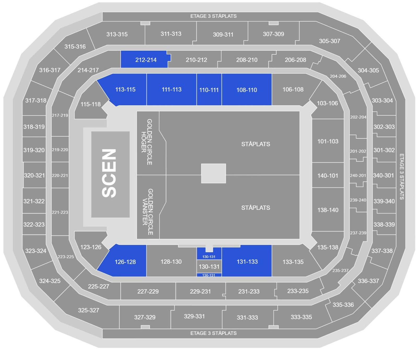 The national Arena of Sweden is the largest stadium in the country in terms of seating capacity and can easily accommodate over 50000 visitors during events. The seats of the stadium are spread across multiple levels and these levels are published explicitly on the Strawberry Arena seating plan with rows and stands. This stadium has three levels and the seats are spread across these levels. The location of the levels can be seen on the seating layout along with the field.