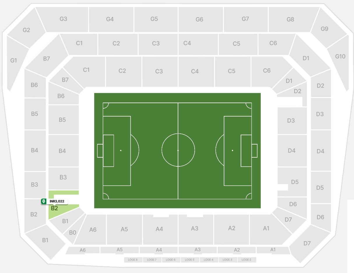 The names of all the stands and rows are mentioned on the seating layout map along with all the necessary information. More than 38000 seats of the stadium are spread across the multiple floors and levels. The location of the pitch, stands, rows, ground, goal post, etc are drawn on the seating arrangement map.