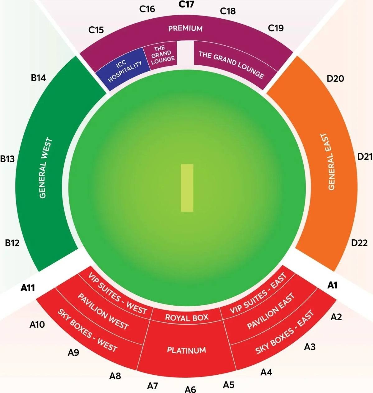 The seating chart of the Dubai stadium displays the locations of the entry gates, the platinum seating area, the Royal Box, the VIP suites, the Pavilion area, and the hospitality area. The location of the general seating, lounge, and premium area is also depicted on the Dubai International Stadium seating chart with rows to find seats easily. The layout of the pitch, stands, rows, sections, and aisles makes it easy to locate the best view seats. The India-Pakistan Asia Cup 2025 match is also expected to be hosted at the Dubai International Cricket Stadium.