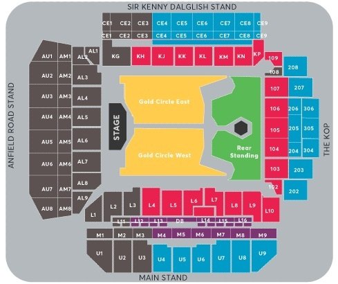 The seats in front of the stage and the standing area in the field are among the best places to experience the concert. The seats and standing area in front of the Anfield Stadium stage are among the most expensive. The seats in front of and on the side of the stage in the lower levels also offer good sightlines and sound.