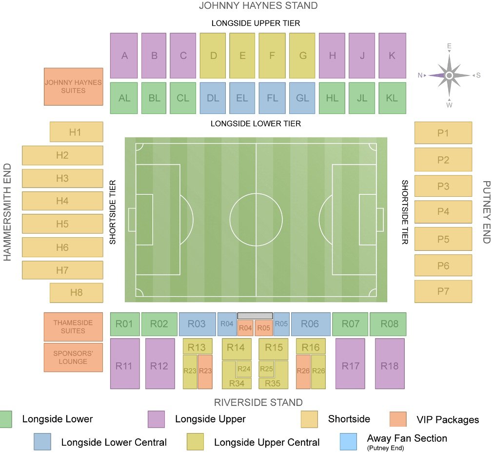 Riverside stand is situated at the bank of the River Thames, and it can be seen on the map. Johnny Haynes Stand, Putney Stand, and Hammersmith End are also mentioned on the map. The location of all the stands is depicted on the map along with their rows. The locations of the longside and shortside upper and lower tiers are also mentioned for easy identification. The location of VIP seats, premium seating, VIP package seats, suites, boxes, away supporter fans, etc can also be located on the map.