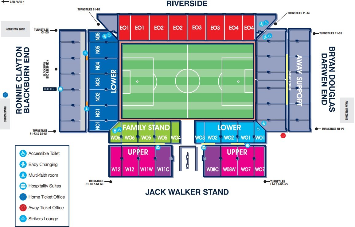 Accessible seats and wheelchair-friendly areas are available at Ewood Park. The location of the accessible seats and all the facilities are depicted on the Stadium layout.