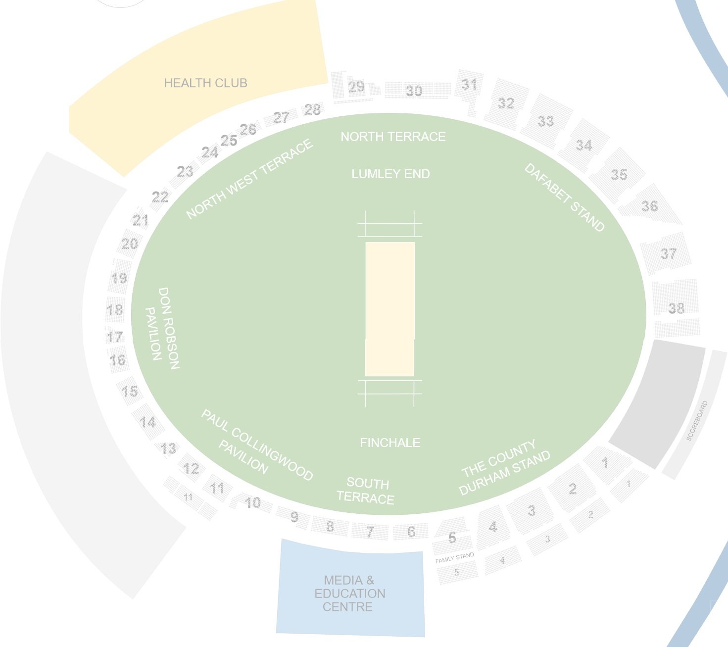 The detailed map of the Durham cricket stadium shows all the important details of the ground. The names of the stands, along with the row numbers, are mentioned on the map. The location of the pitch, pavilions, stands, media centre, score board, etc, are depicted on the Chester Le Street Riverside Ground seating plan map.
