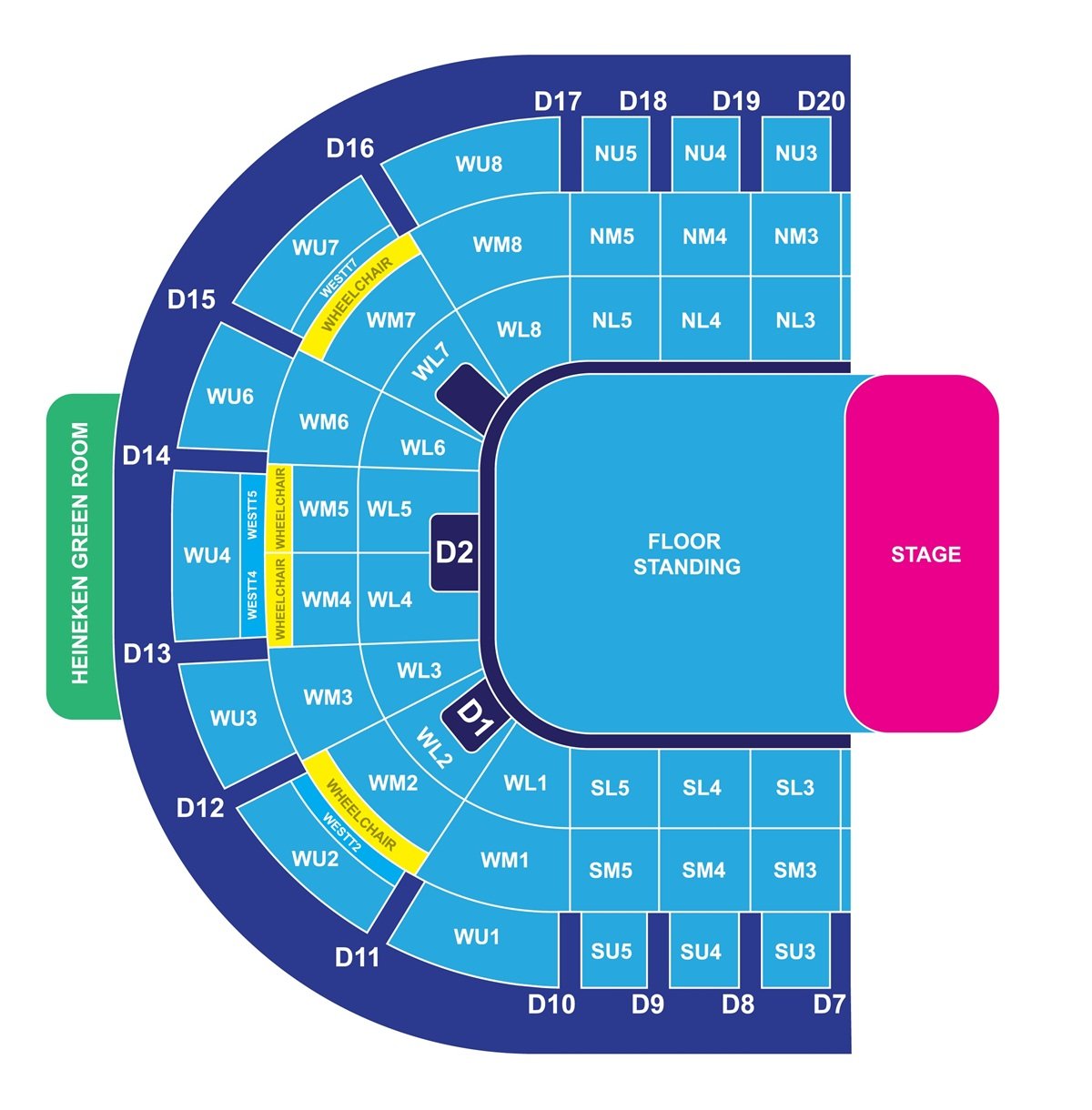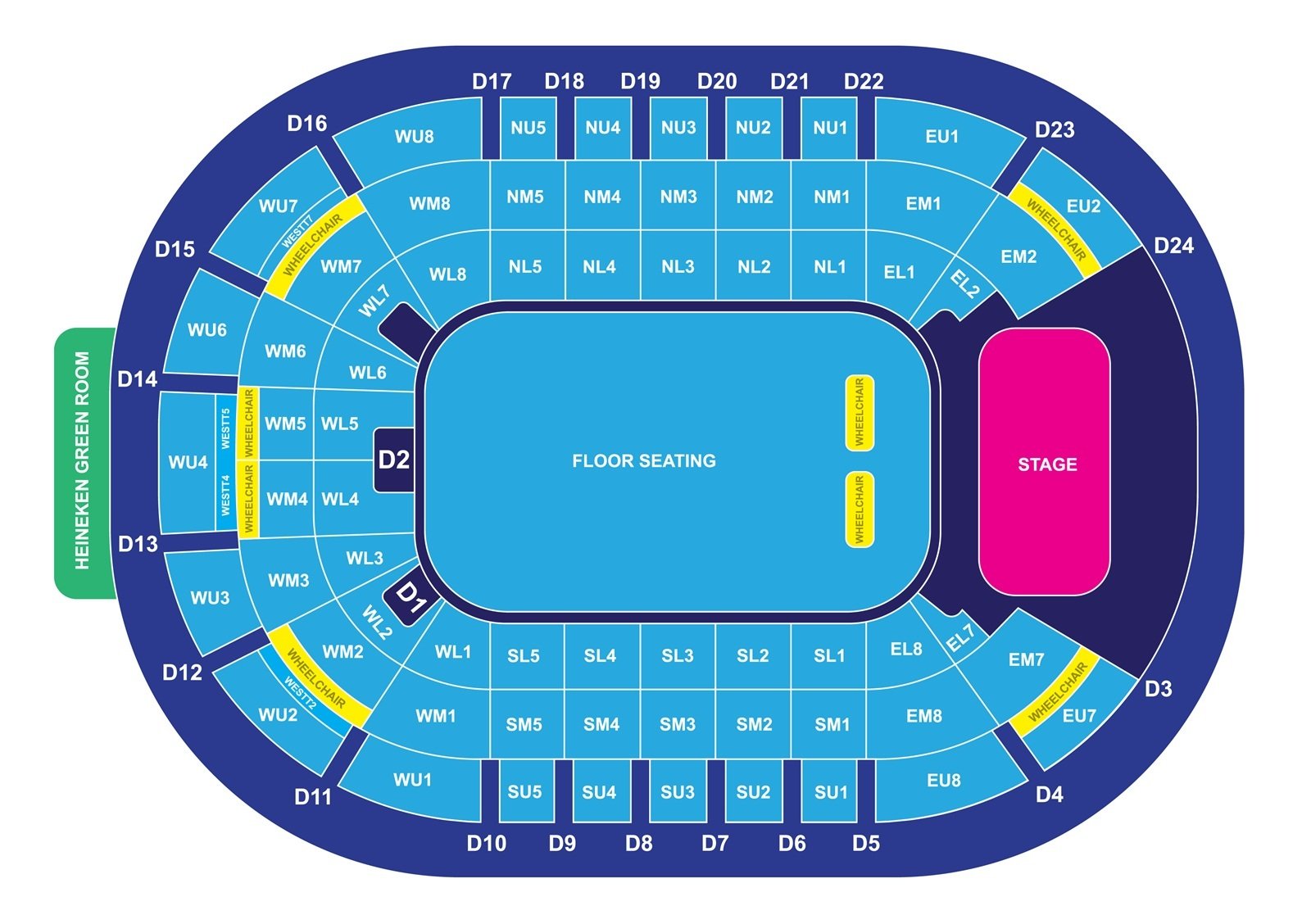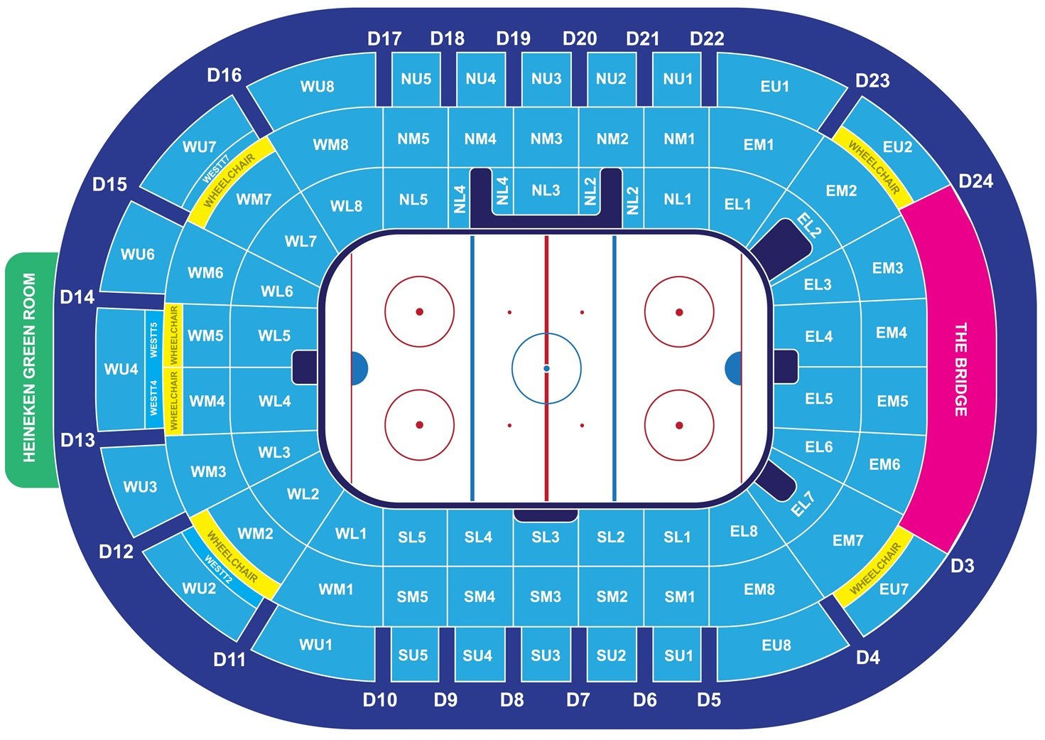 It is one of the largest indoor stadiums in the country, and a seating arrangement chart helps in locating seats inside the SSE Arena. More than 11000 seats of the stadium are spread across multiple levels and stands. The location of wheelchair friendly areas and wheelchair seating are mentioned on the map in different colour.