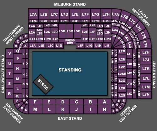 The on-field seats and standing pits are considered great due to their close proximity to the stage. These are among the most in-demand and expensive areas at St James Park during high-voltage concerts. The seats in front and to the sides of the stage are good at the lower and middle levels for a good view of the concert. The seats in the upper level are affordable, and spectators get a wider view of the stage. The last row seats, extreme corner seats behind the stage area, and extreme side seats should be avoided due to limited views.