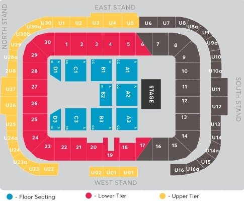 Stadium Milton Keynes is used for events and musical concerts due to its large seating capacity. A performance stage is set up on the MK Stadium during the hosting of High Voltage concerts along with the temporary arrangements to accommodate the additional crowd. The location of floor seating, lower tier, and upper tier can be seen along with the location of stands. The location of the rows along with numbers are also depicted on the Stadium MK concerts seating plan.