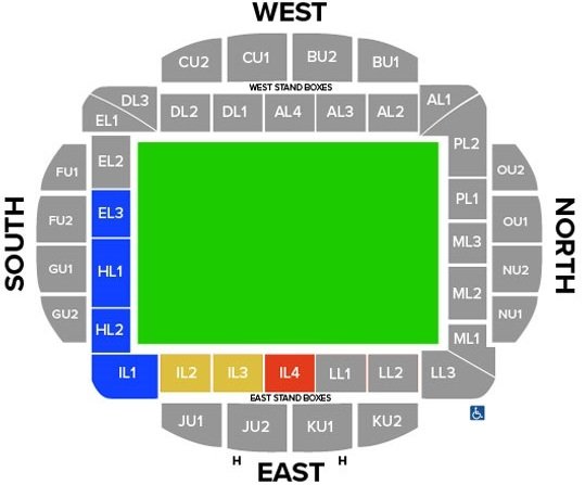 It is a big stadium in terms of seating capacity. The stadium’s seats are spread across multiple levels and stands to accommodate the crowd. The Toughsheet Community Stadium seating plan depicts the locations of all stands, boxes, and row numbers.