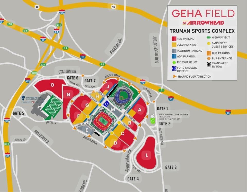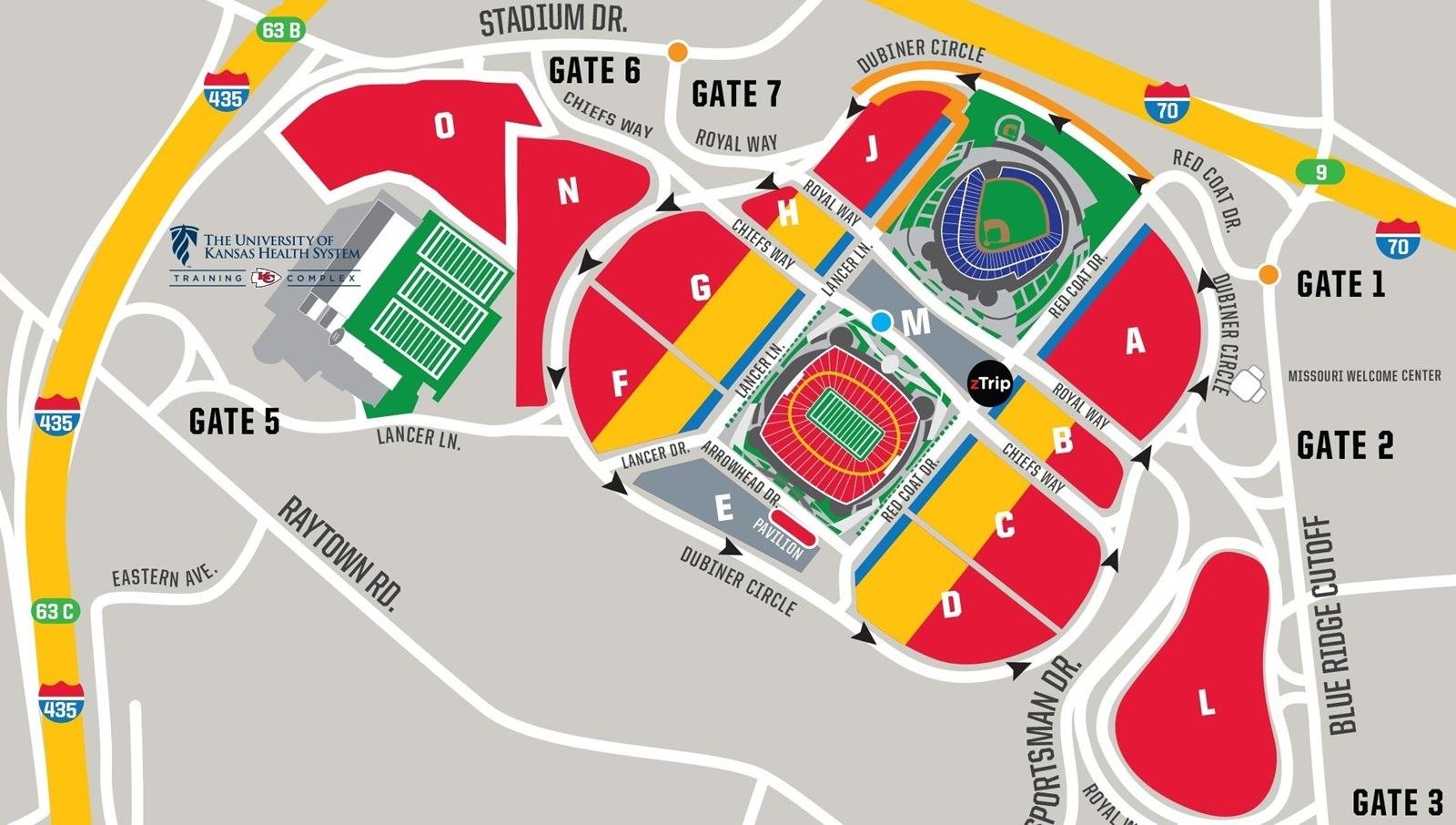 Ample parking space situated near the stadium to accommodate more than 27000 vehicles, including 400 buses. Multiple parking lots are located near Arrowhead Stadium, and their locations are depicted on the Kansas City stadium map. The location of the nearby roads, landmarks, and Kauffman Stadium. The parking lots at Kauffman Stadium are also used by Arrowhead Stadium when no event is scheduled.