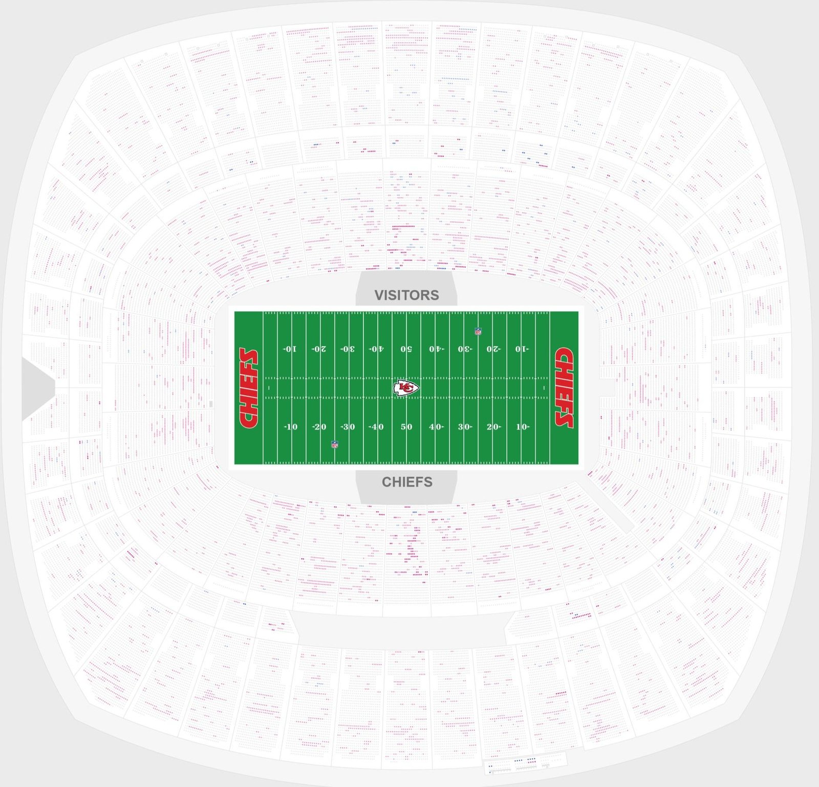 The location of the Kansas City Chiefs team area, visiting team area, dugouts, goalposts, pitch, etc, can be seen on the seating map. Visitors can locate the upper reserved seats, upper box seats, field box seats, field reserve seats, etc, on the seating plan, and they are among the expensive seats on the ground. All the stands and their rows are displayed on the seating plan.