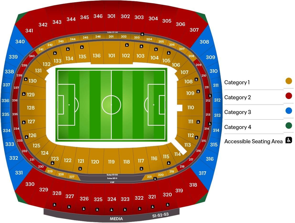 The seats behind the goal posts on the middle level fall into category 2 and are also in demand due to their proximity to the stadium. Category 3 seats are situated on the upper level behind the goal posts. Category 4 seats are almost nonexistent as these are situated in the extreme corner of the upper level.