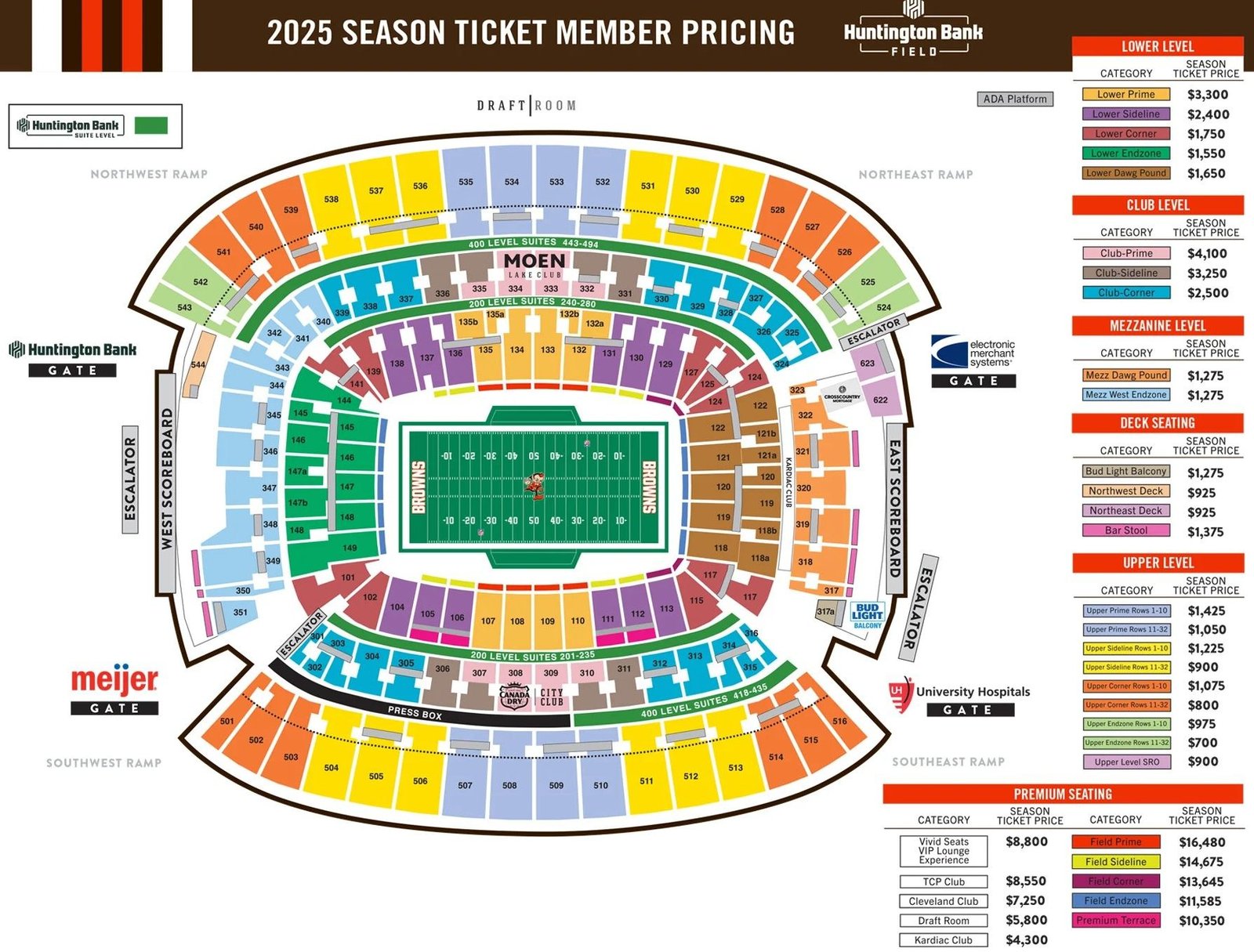 Cleveland Browns Stadium is a multipurpose stadium in the United States. This stadium is used for various sports, including football, soccer, and hockey. Huntington Bank Field is the current name of the stadium after the change in naming rights. This stadium is primarily used for hosting football games during the NFL. It is one of the largest stadiums in the USA, with a capacity of 67,431. Cleveland Browns Stadium seating chart with seat numbers and rows helps in finding the reserved seats of the visitors.