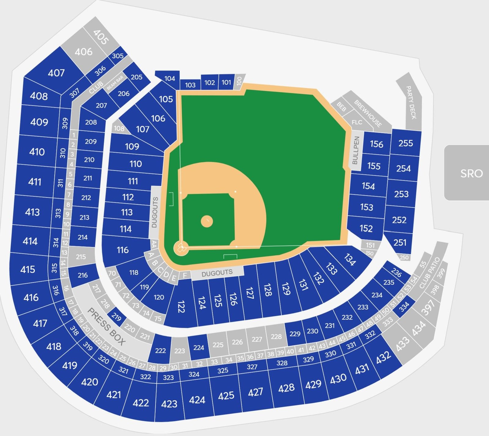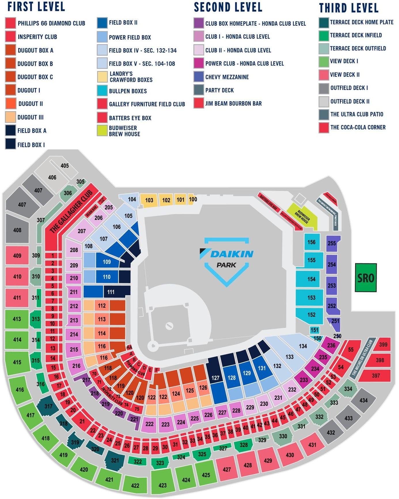 It is the biggest baseball stadium in Texas, and it can accommodate more than 41000 visitors during baseball games. The seats of the stadium are spread across multiple levels and floors to provide the best view from each seat. The seats of the stadium are spread over three levels, and the names of all 3 levels are depicted on the seating layout.
