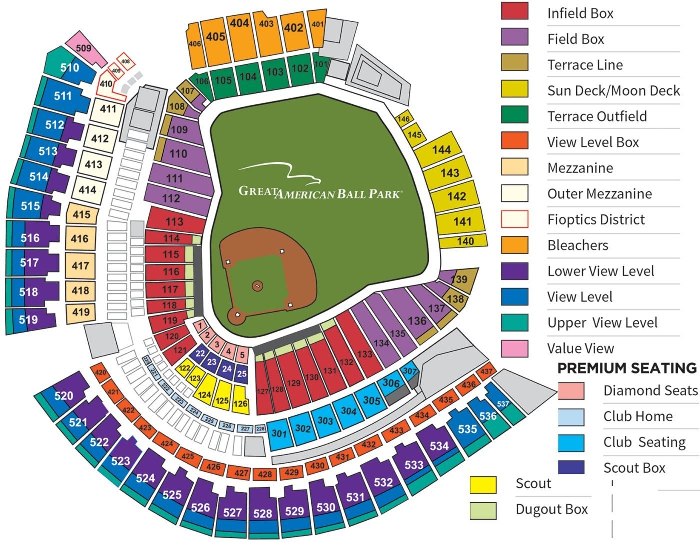 It is a big stadium in terms of seating capacity and can accommodate more than 43000 visitors during a baseball game. The Great American Ball Park seating chart with rows and seat numbers helps to find the best view seats. The names of the stands are depicted on the seating chart in different colours, with all the important information. The colour coding of the stands helps in finding the stands and rows while visiting.
