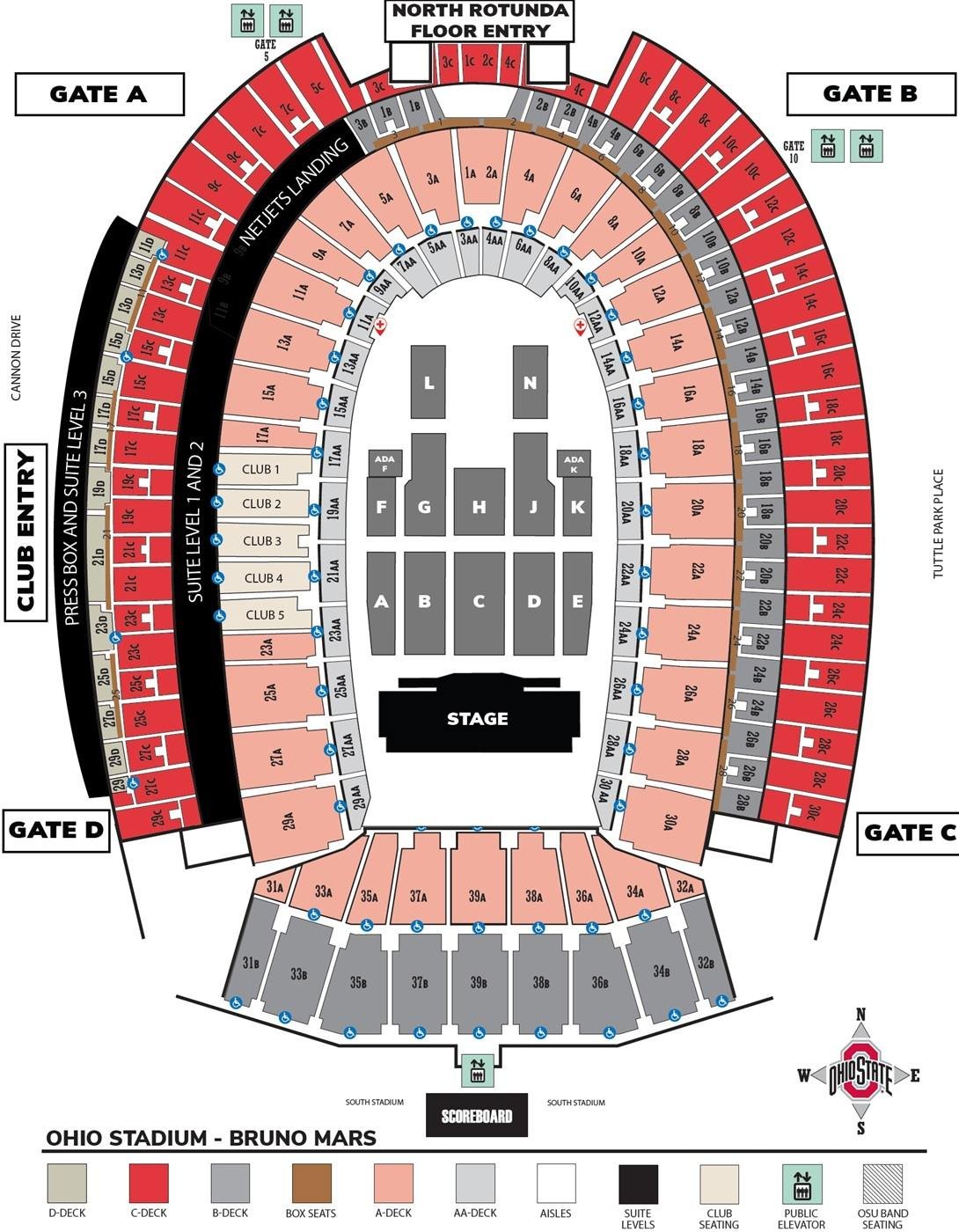 All entrances to the Ohio Stadium are shown on the seating layout. The color-coded maps show the location of all seat categories to help visitors find their reserved seats. The location of the premium seats, clubs, suites, decks, boxes, and elevators is also shown on the Bruno Mars Ohio Stadium seating layout.
