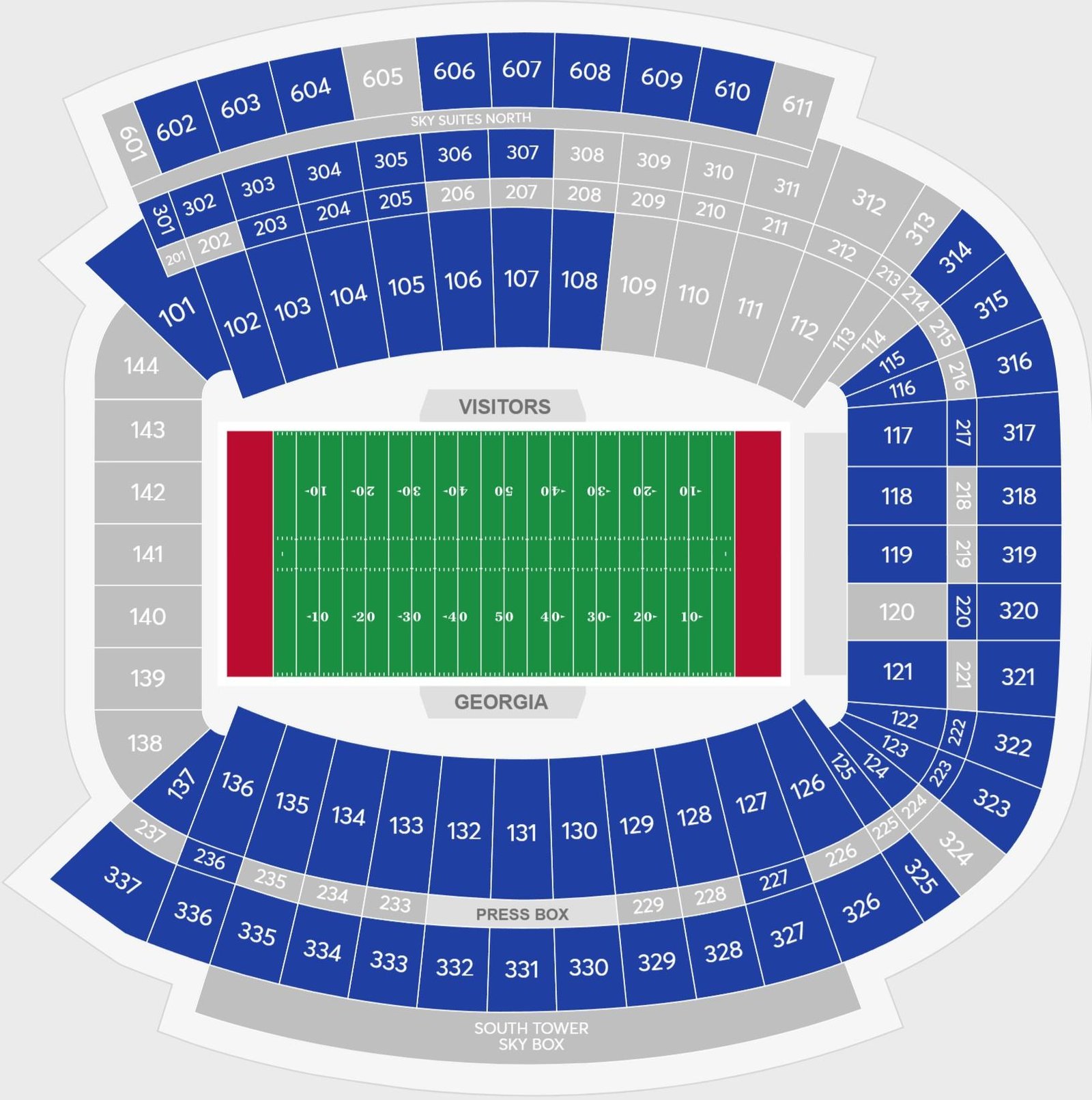 The home games of the Georgia Bulldogs football team are played at the University of Georgia Stadium. This ground is mainly used to host the home games of the football team, and visitors need a seating layout to identify their seats. Visitors can use these maps to locate the best view seats on the ground before booking the Sanford Stadium tickets. The location of the premium seatings like skyboxes, suites, loges, etc are mentioned on the map.