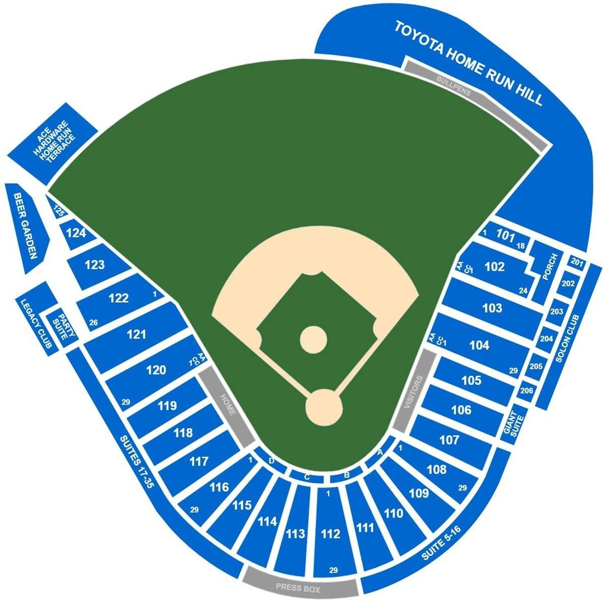 We have shared the seating arrangement map with seat numbers, bullpens, porch, clubs, home team area, visiting team area, suites, lawns, standing area, etc. This stadium is mainly used for the hosting of baseball matches, along with football games.