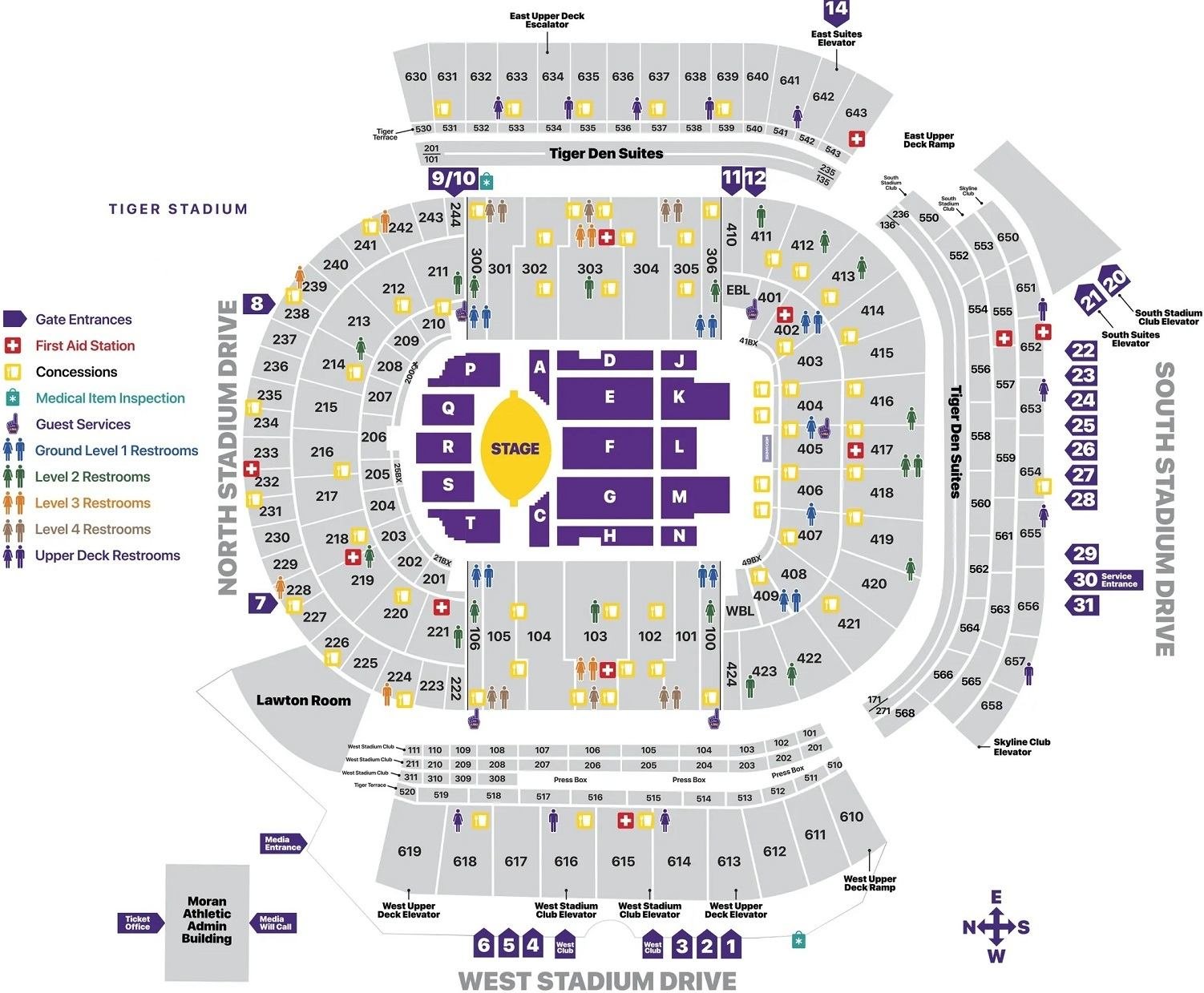 Louisiana State University stadium is the largest sports ground in the state. The seats of the stadium are spread across multiple stands and levels. The location of all the seats is mentioned on the Tiger Stadium seating chart with rows. East, West, North, and South are the four main stands situated at the LSU Tiger Football Stadium. Visitors can see the location of all the levels, their facilities, elevators, escalators, accessible seating, decks, with their row numbers and sections.