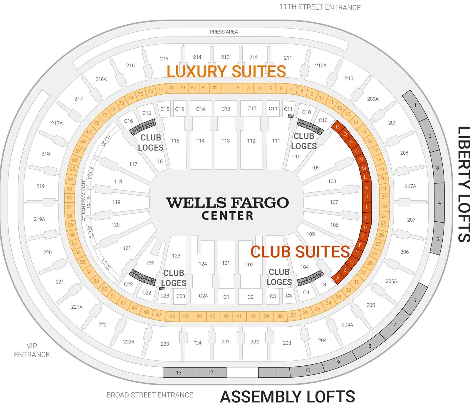 Wells Fargo Center offers several premium seating categories for visitors seeking added comfort and services. Suite seating provides private viewing areas, in-seat service, and lounge-style amenities, making it popular among corporate groups and families.