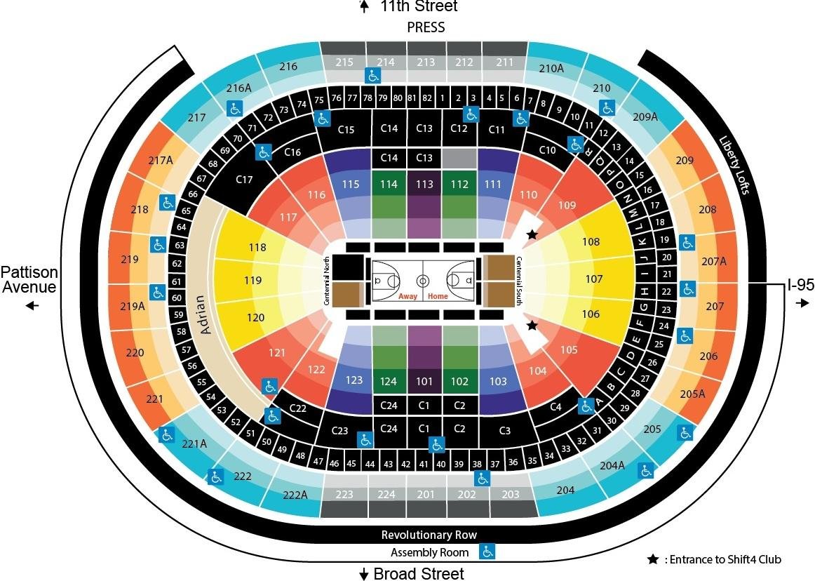 Xfinity Mobile Arena is an indoor stadium located in Philadelphia, United States. It is one of the most popular indoor stadiums in the state. It has had multiple previous names in the past due to sponsorship reasons. Wells Fargo was the Arena’s previous name since August 2025. It is the 9th-largest basketball stadium in the United States in terms of seating capacity. Center’s seating capacity is 21000 for basketball games. The seating plan with seat numbers and rows is useful to locate the best view seats in the stadium.